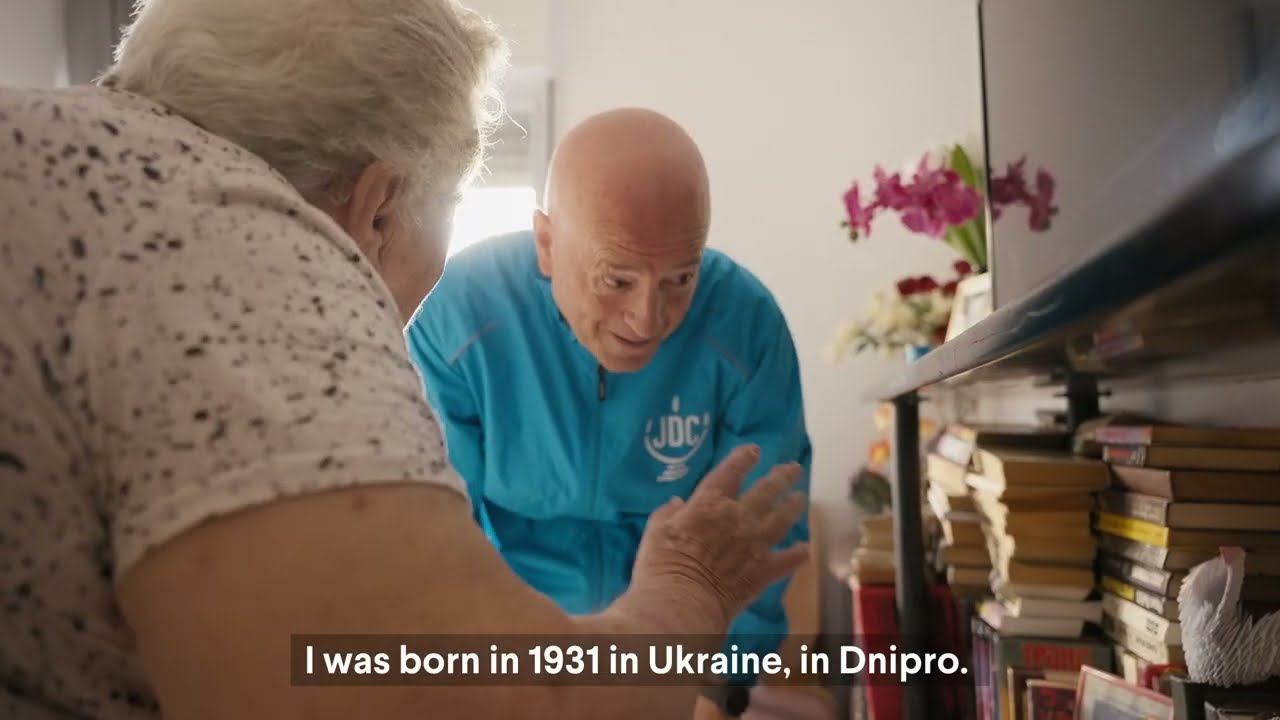 ![A blond woman in a JDC blue jacket high-fives a smiling elderly Jewish man sitting on a couch in Ukraine.]()